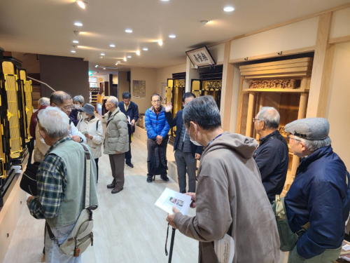 JR彦根駅に集合し、最初の見学先である「井上仏壇(七曲り職人通り)」では、仏壇職人の息を吹きかけると飛びそうな金箔貼りに魅了され、家が建つような高額な仏壇を見て驚き、その後ほっと一息、昼食場所の「しる万」に向かいました。